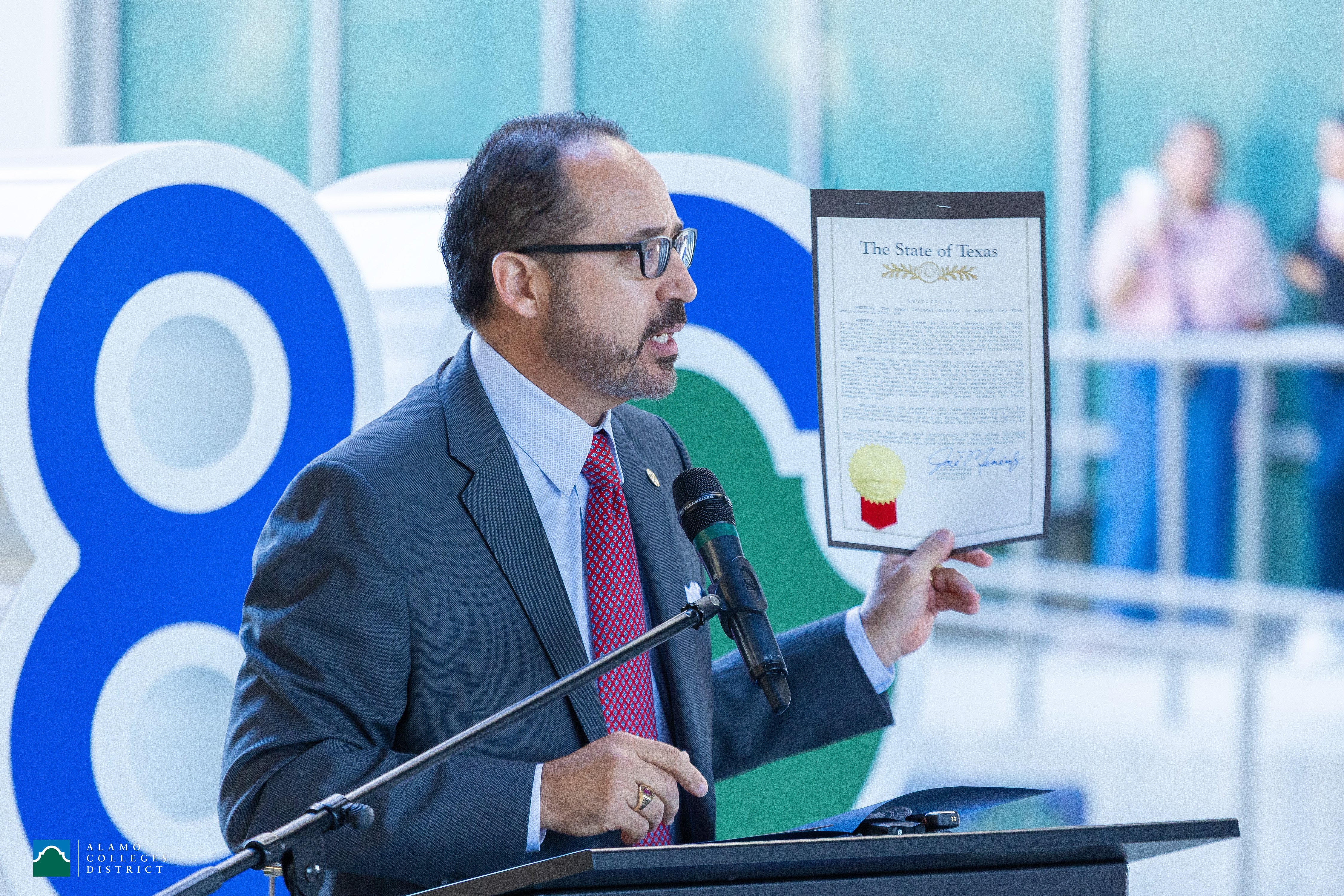 The morning celebration featured remarks from Board Chair Dr. Clint Kingsbery, Chancellor Dr. Mike Flores, Student Trustee Josiah Rodriguez, and his mother, Roxann Pena – both students at San Antonio College – and State Senator José Menéndez, who presented an official proclamation from the Texas Senate in recognition of the Alamo Colleges District’s 80-year legacy.