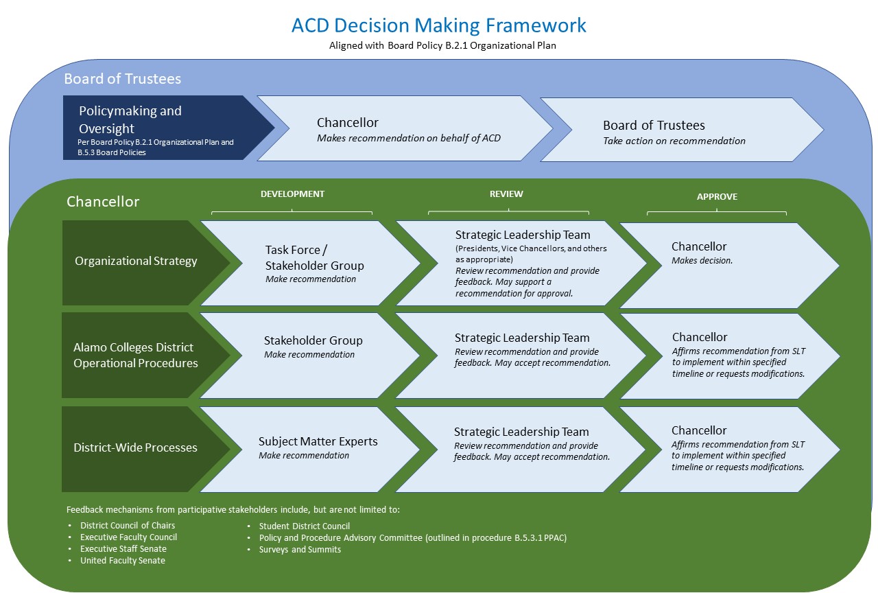Shared governance provides a representative voice for faculty, staff, and students in related matters across the Alamo Colleges District. Participating in shared governance is an opportunity for leadership, subject matter experts, and stakeholder representatives to foster open communication, exchange information, share ideas, challenge each other to be innovative, and work together toward a common goal.