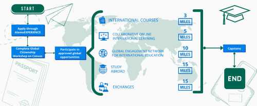 Participate in any qualifying international activity, complete the capstone project to demonstrate your global competence, and earn “miles” toward your journey to the Alamo Global Student Distinction.