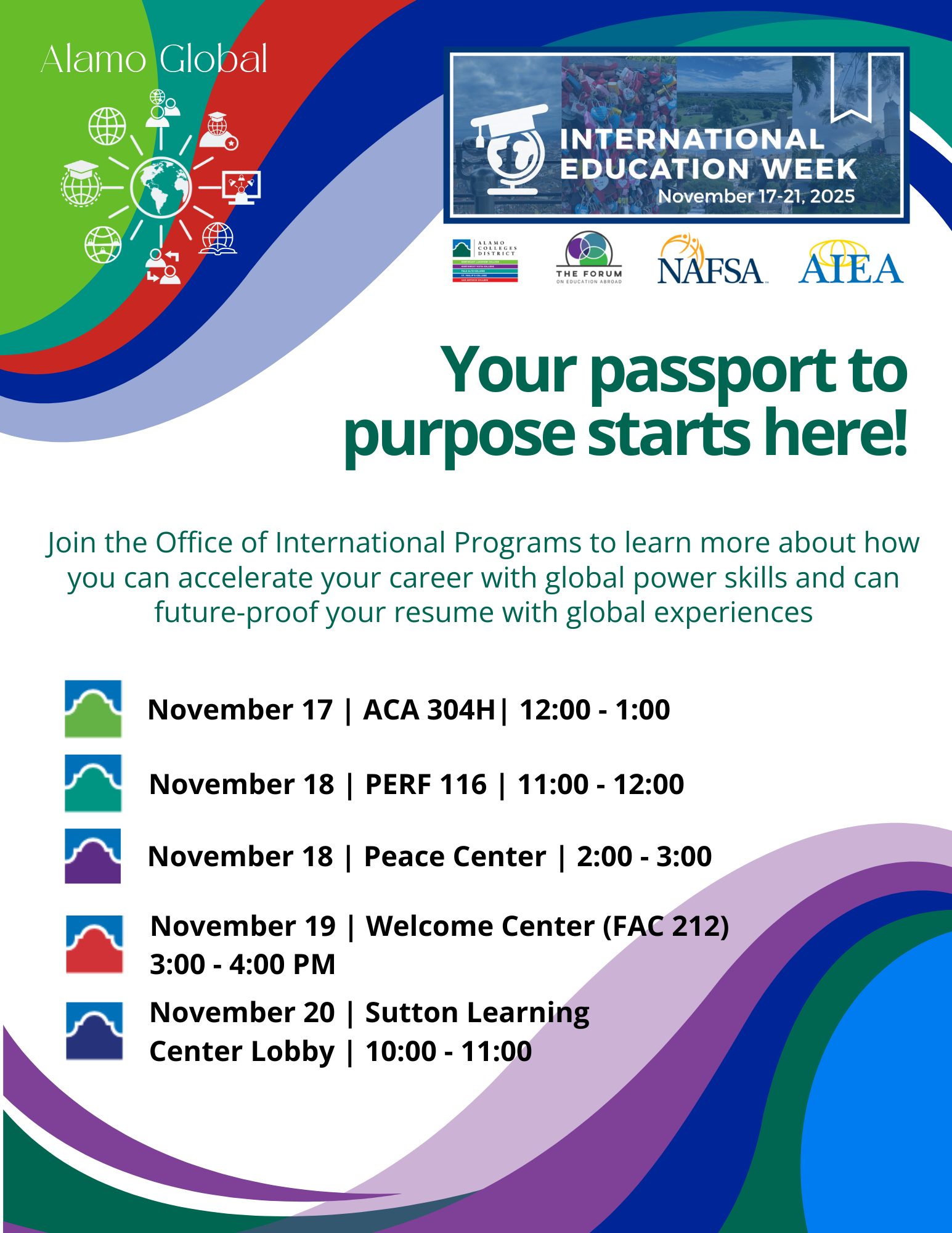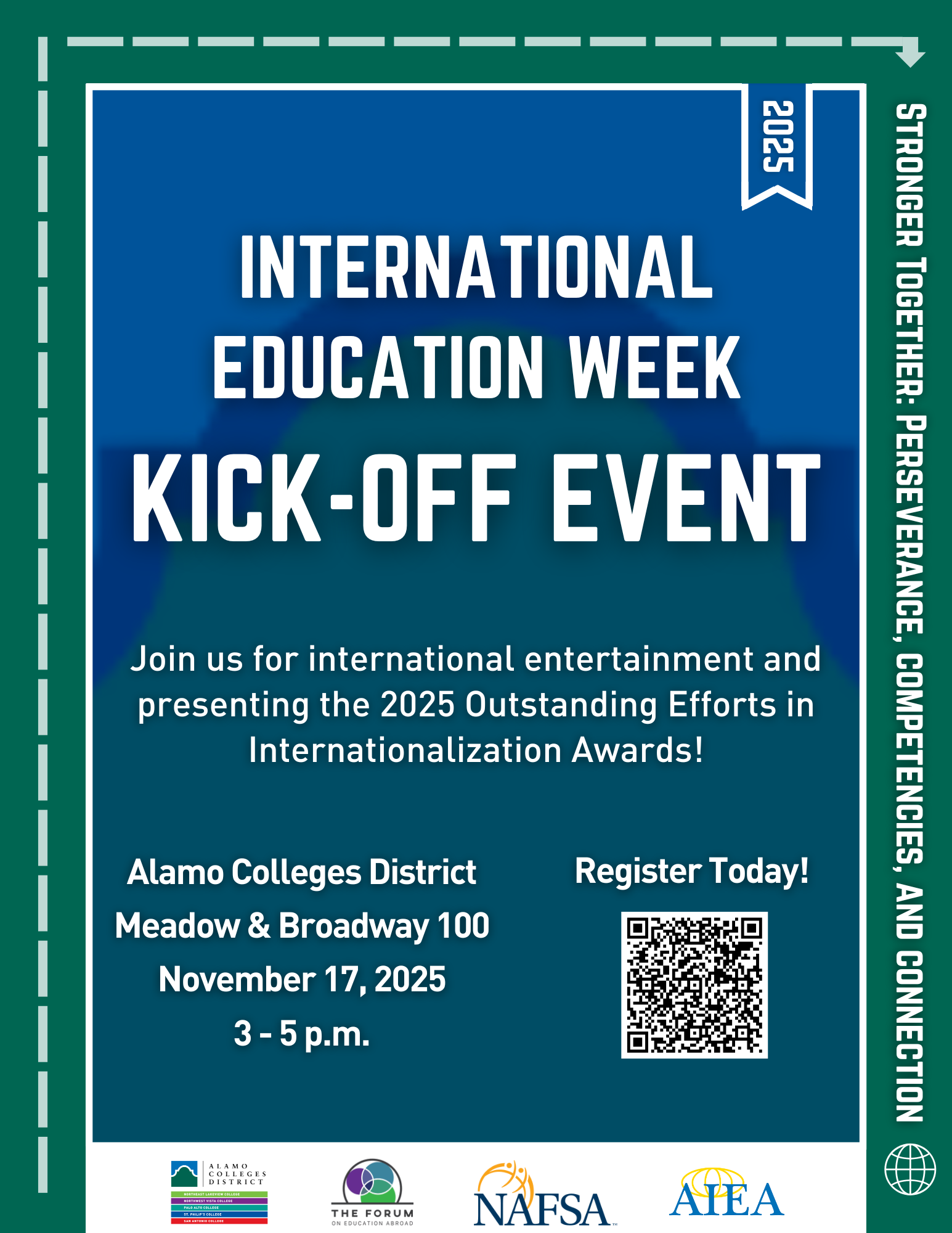 International Education Week (IEW) is a time to unite and celebrate international activities across our Colleges, fostering global competence. This year, IEW will be November 17-21, 2025, and we’re excited to join The Forum for Education Abroad, NAFSA: Association of International Educators, and the Association of International Education Administrators (AIEA) in celebrating globally minded learning across the Alamo Colleges District!