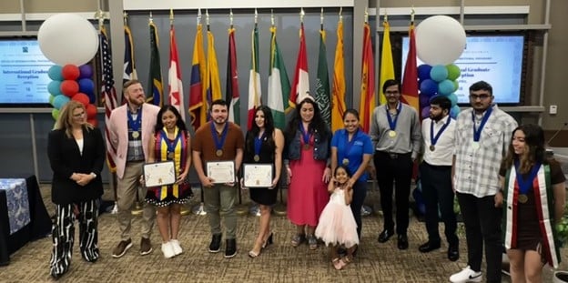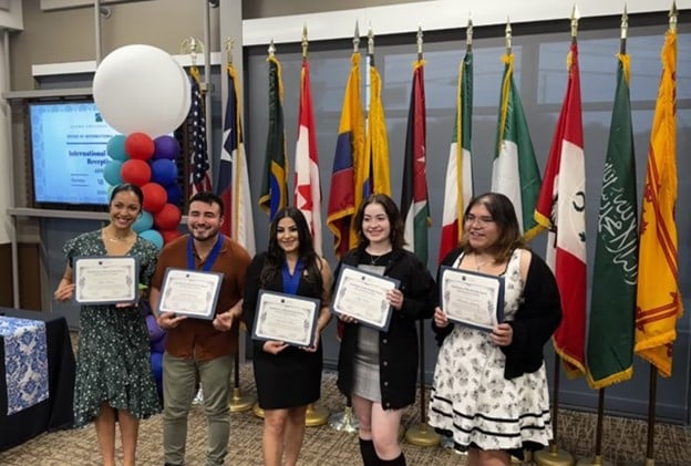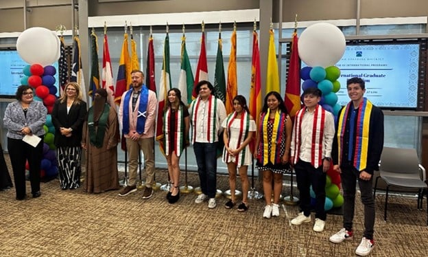 By Reynaldo Cano Continuing an annual tradition, the Office of International Programs hosts a graduation ceremony for all international students from all the colleges. At this year’s 2024 International Program Graduate ceremony, speakers included Dr. Eric Castillo, Associate Vice Chancellor of Arts, Culture, and Community Impact, Dr. Homer Guevara, Faculty member from Northwest Vista who is representing the International Faculty Committee, and Ross Duncan, a Scottish student from Palo Alto College. Twenty-three students worldwide were recognized, representing Mexico, Vietnam, Jordan, Brazil, Canada, Scotland, Peru, Ukraine, India, Spain, Nigeria, Saudi Arabia, Ecuador, and Colombia. This year’s ceremony held added significance as we expanded our celebration to include the recognition of our Alamo Global Student Distinctions (AGS) graduates, who are also considered international graduates. AGS students earn MILES through participation in international activities, and their total MILES determine whether they are awarded the Citizen, Diplomat, or Ambassador medal. Additionally, we will announce the winners of the Global Challenge contest, whose prize includes attendance at the HACU Conference in Spain. This year marks the 12th anniversary of our traditional graduation reception.