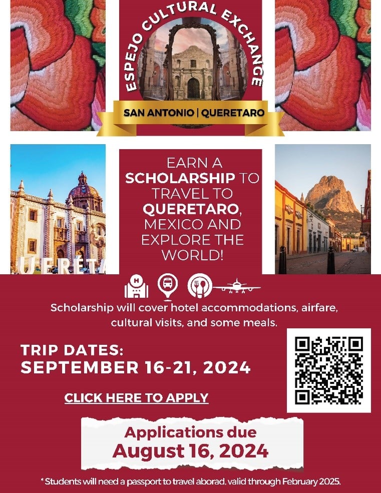 By Reynaldo Cano The deadline is approaching for a unique opportunity for students from our colleges to participate in a cultural exchange to Queretaro, Mexico. If chosen, five outstanding students from the Alamo Colleges District will be immersed in the arts and culture of Querétaro, Mexico, coinciding with the signing of the Friendship Cities Agreement between San Antonio and Querétaro and the grand opening of the "Al Otro Lado del Espejo" exhibit at the Museo de Arte de Querétaro. This cultural exchange aims to celebrate and promote global competence and multiculturalism, focusing on the cultural linkages between San Antonio and Querétaro. Students will engage with the works of renowned San Antonio artists, explore local artistic expressions of Querétaro, and gain a deeper understanding of the arts scene in San Antonio and its connection with the Alamo Colleges District. Aligned with the Alamo Colleges Global Learner Pathway, this experience will enhance global competence, foster empathy through diverse cultural connections, and prepare students to become future global citizens in an interconnected world. The deadline to apply is August 16th at midnight. Please encourage anyone interested to apply using the QR code on the flyer. Please contact Isabel Breuer for more information at 210-485-0082 or ebreuer2@alamo.edu. |