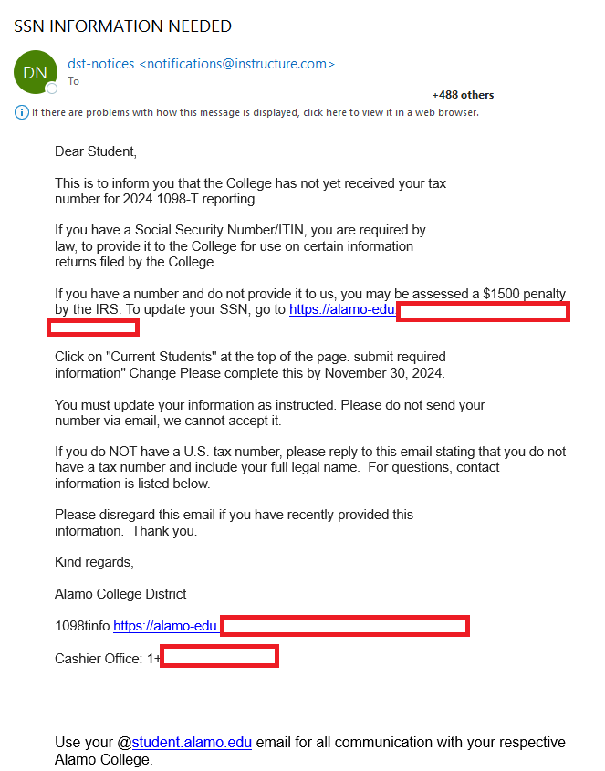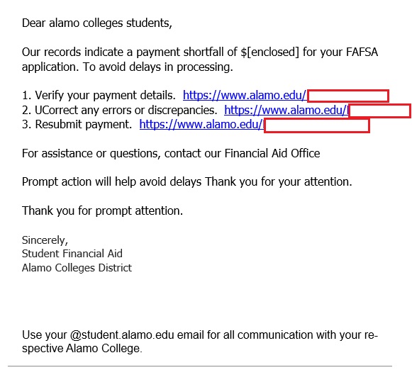 Phishing emails often use generic greetings like “Dear Student” or “Dear alamo colleges students” rather than your actual name.