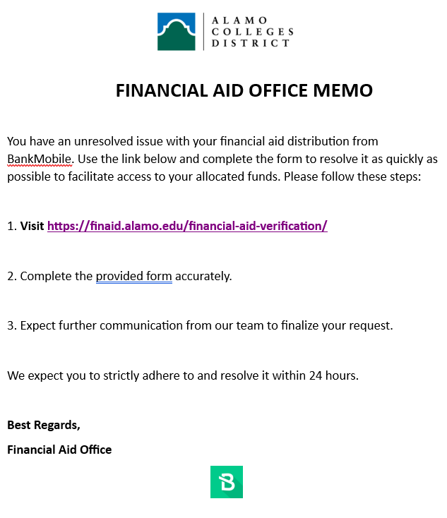 Alamo's Student Financial Aid Office, IT department, Refund servicer- BankMobile, and other offices will never ask for your password, Social Security number, or credit card information through email.