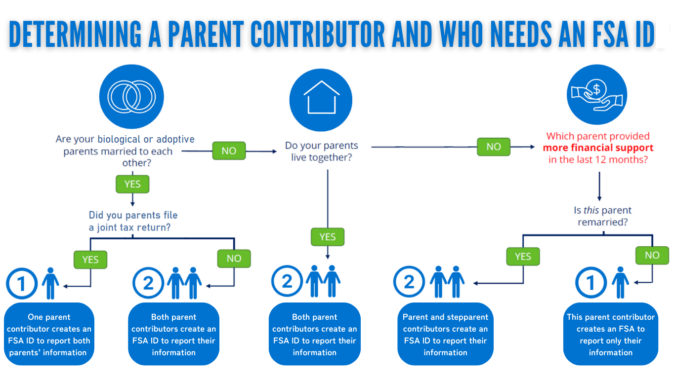 The new FAFSA is student driven, so that means the student's answers on their section will determine who will be a contributor. Contributors besides the student and parent may now include the student’s spouse or the parent’s spouse (stepparent). Contributors will each log in to the FAFSA separately with their own FSA ID account, to complete each of their specific sections and questions that only they can view.