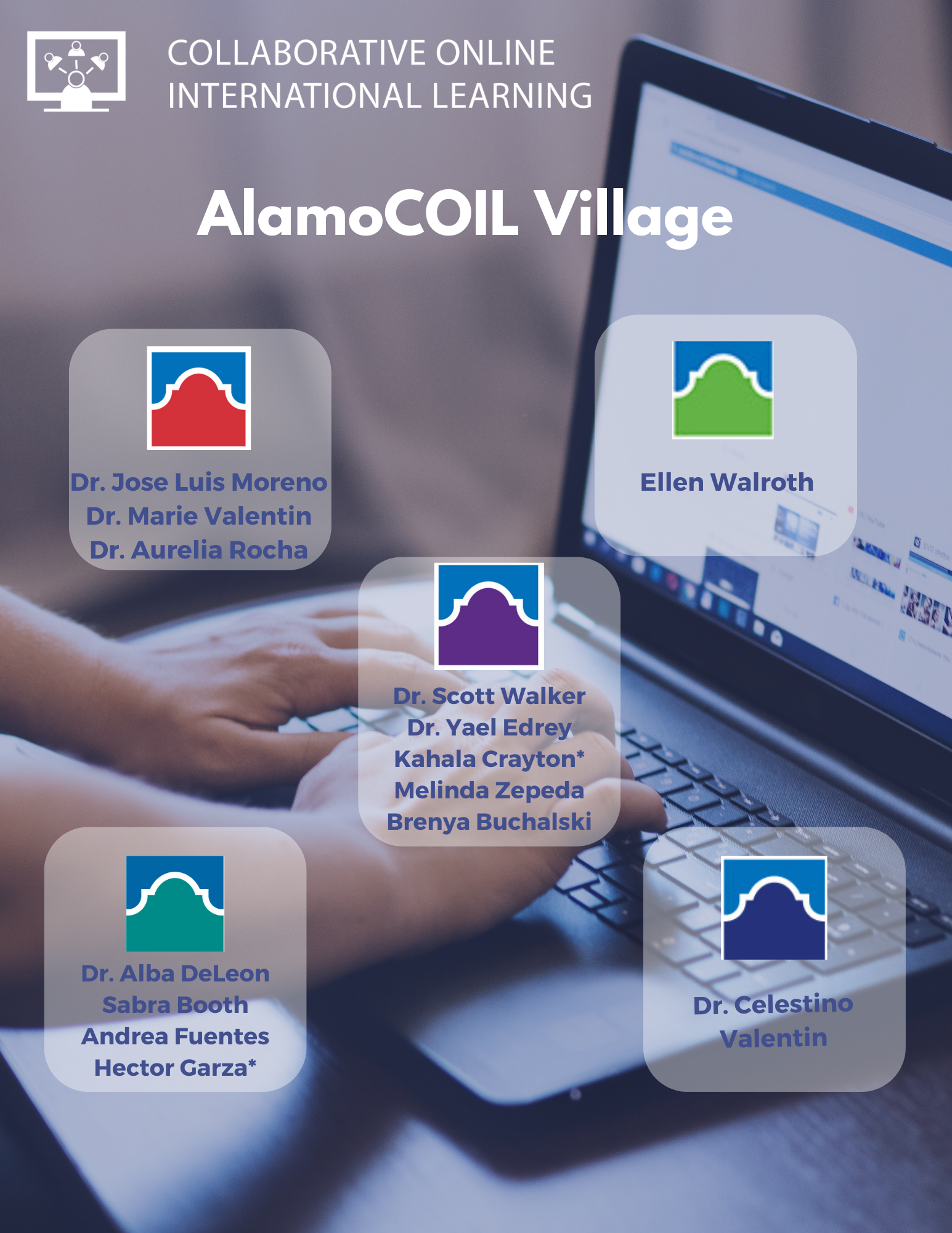 The AlamoCOIL Village is open to all faculty. Our list of professors changes each semester and includes Dr. Jose Luis Moreno, Dr. Scott Walker, Dr. Alba DeLeon, Sabra Booth, Dr. Celestino Valentin, Dr. Marie Valentin, Melinda Zepeda, Dr. Aurelia Rocha, Dr. Yael Edrey, Andrea Fuentes, Brenya Buchalski, Ellen Walroth, Hector Garza, and Kahala Crayton.