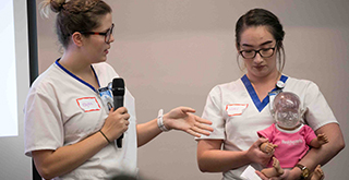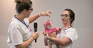 01-02---One highlight of the Summer 2018 classroom series at St. Philip's College known as Jessica's Project was a training aid---a robotic baby with fully transparent skull---showing four quadrants of the brain in a child to demonstrate the dangers of shaken baby syndrome in a teen pregnancy prevention awareness project presentation co-led by (from left) level three St. Philip's College vocational nursing students Kaylee Anderson and Nancy Figueroa. The event for 130 of the college's vocational nursing and natural science students took place June 28 in the college's Campus Center building in San Antonio's Denver Heights neighborhood. (SPC Photos by Julysa Sosa)