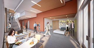 The labs in the new facility are located along a public corridor for easy access and visibility of the activity within by both students and visitors. Back-of-house corridors connect the labs to food and dry goods storage, classrooms, and other support areas. The public spaces of the building are designed to feel like a hotel – spacious, easy to navigate, and with multiple small seating areas to promote social interaction. Additionally, the hospitality program features include a classroom with mock hotel office and breakout rooms with retractable walls that can function similar to hotel conference rooms or as a hotel ballroom. An attached warming kitchen allows both Hospitality and Culinary students to host and practice large catering events. The building also includes a 100-seat tiered lecture hall that can double as a food demonstration kitchen, faculty offices and a loading dock for efficient delivery of goods in and out of the building.