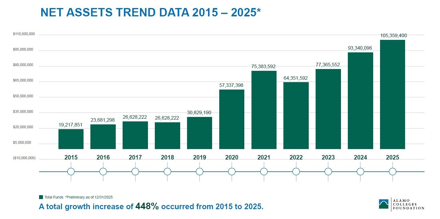 The Alamo Colleges Foundation total assets has grown to over $105 million in 2025.