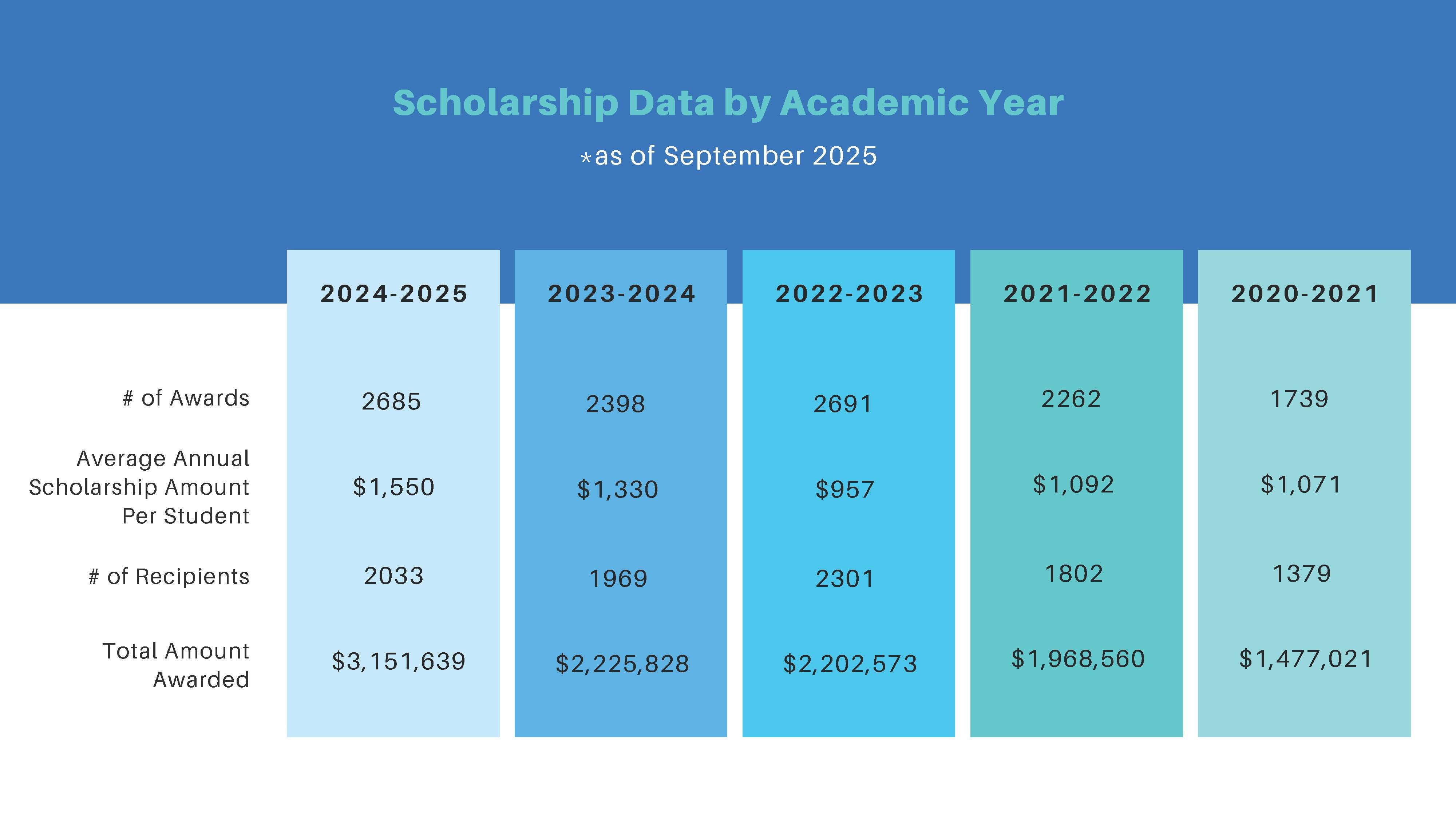 The number of recipients represents unduplicated students who received funding during the year, while the number of awards indicates the total scholarships distributed.
