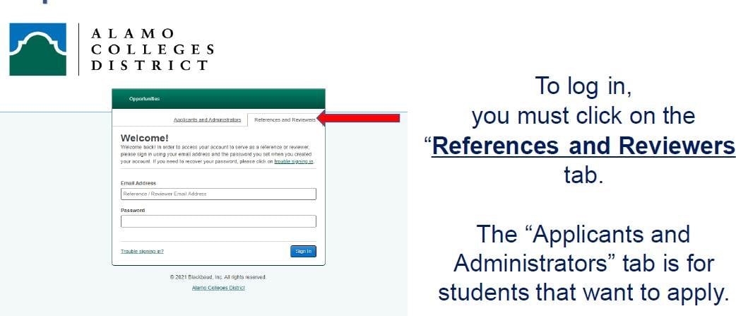 Please make sure you are logging in under the 'Reference and Reviewers' tab. Here is a direct link: https://alamo.academicworks.com/users/sign_in#references_and_reviewers