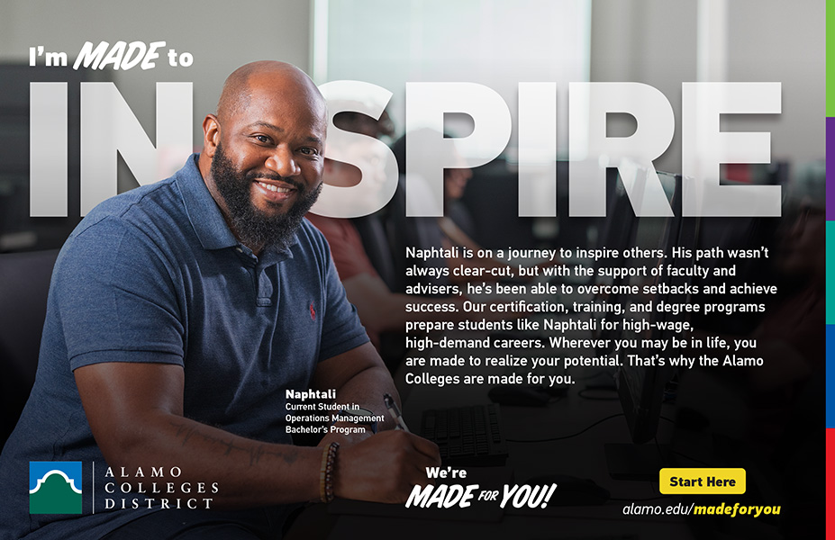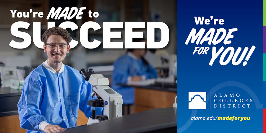 The Alamo College District is thrilled to unveil the latest iteration of the “Made for You!/¡Hecho Para Ti!” marketing campaign. The campaign is The Alamo Colleges inaugural unified campaign. It continues to showcase students with a kaleidoscope of talents, perspectives, and backgrounds who seek the transformative power of education from one of the Alamo Colleges.