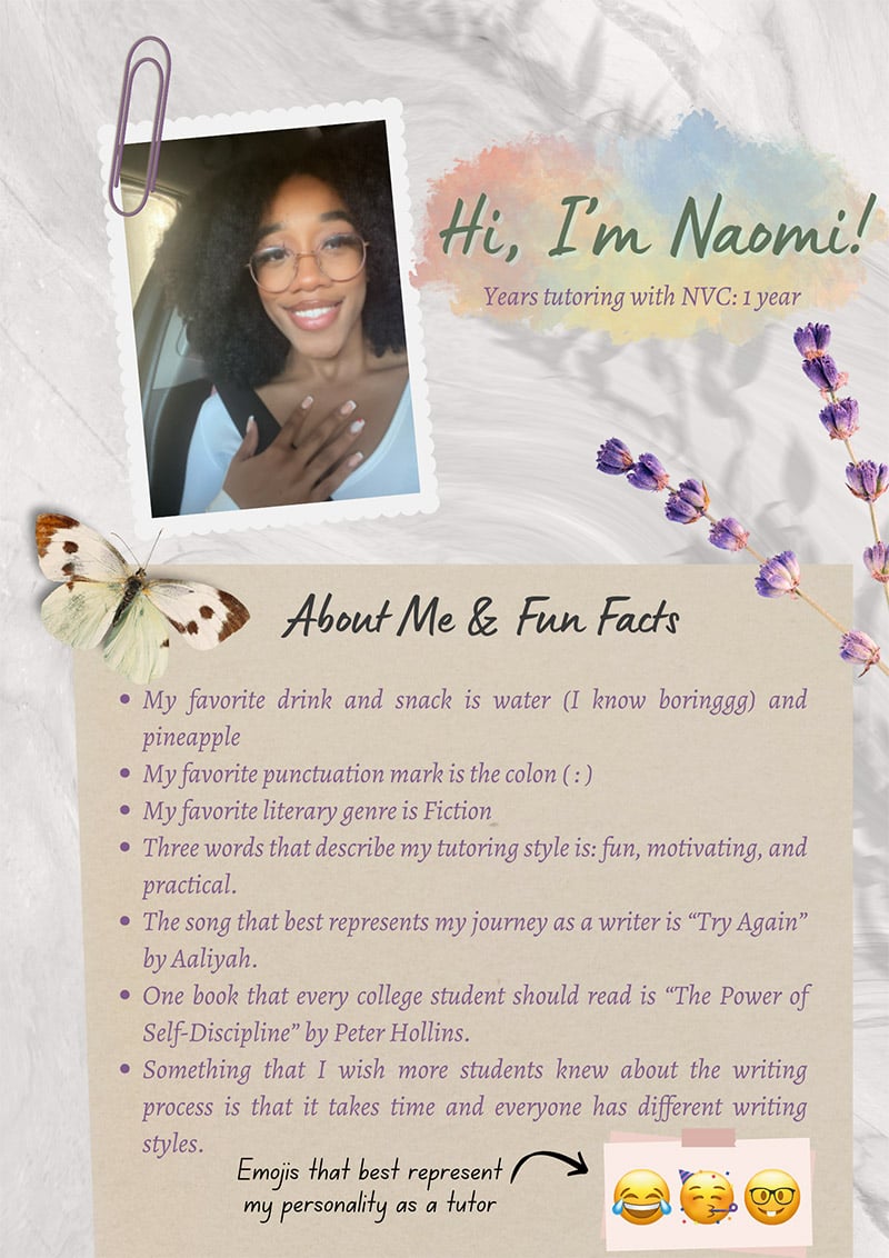 | Three words that describe tutoring style: | Patient, friendly, encouraging |