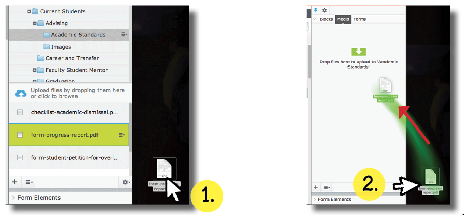 2. Click-hold and drag the file to the “Media” section. (A message will appear in the media folder saying to “drop files here to upload to your designated folder”).