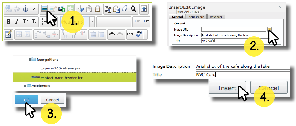 Simple file names will help you find files quickly. For example, if you are naming an image of one of NVC’s buildings, start with the size of the image, then follow up with the buildings formal name, and lastly a number that indicates the order of which the images were taken.