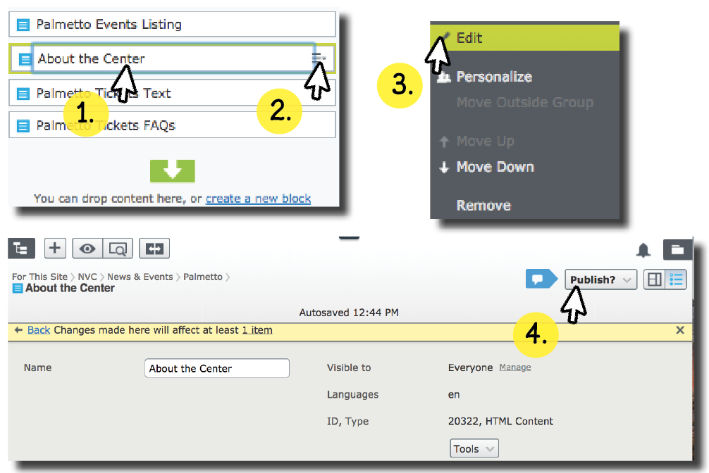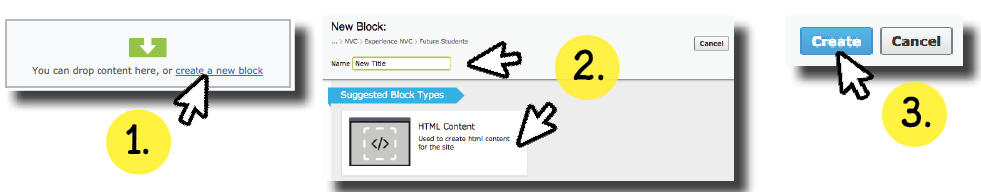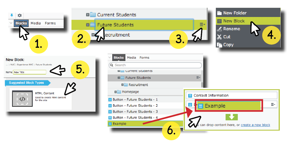 The two methods to create a block are to click on a folder’s drop-down menu and select “New Block” or through the CMS dashboard and “Create A New Block”.