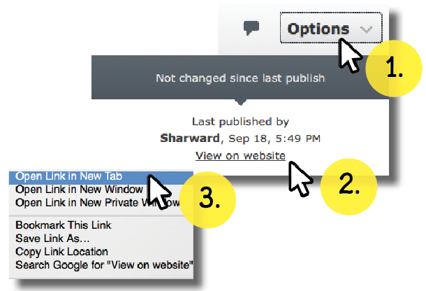 Anytime you make any edits to a page, a notification will appear in the top-right of your workspace over the “Options” menu.