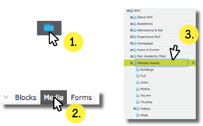 3. Browse through the following folder structure. “For this site” - “NVC” - “Website Assets”. Here, you will find images and video files. The image size will depend on the content area you are in.