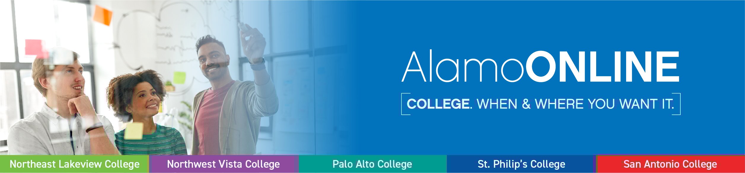 About AlamoONLINEAlamoONLINE represents the range of opportunities for students pursuing degrees, certificates, or other offerings delivered 100% online from Northeast Lakeview College, Northwest Vista College, Palo Alto College, San Antonio College, and St. Philip’s College. At our Alamo Colleges, a 100% online degree, certificate, other offering, or Transfer Advising Guide (TAG) has all courses offered fully online and does not require students to come on campus or to an external site except for required proctored exams or to participate in a clinical, internship, cooperative education, or practicum site. |