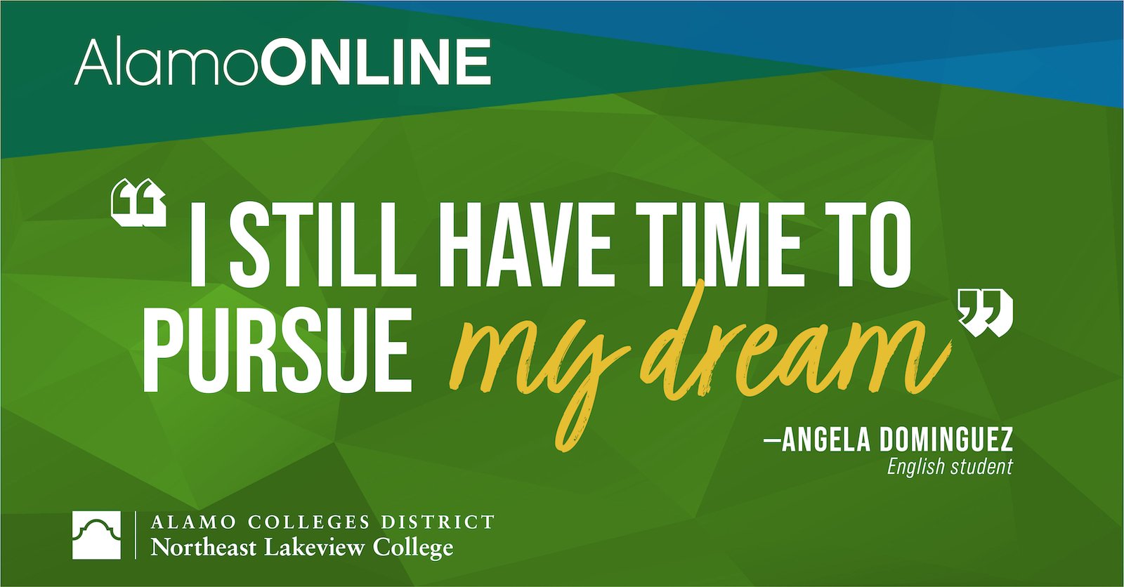 Angela is currently earning a fully online degree in English, with plans to transfer to a four-year university after graduating from Northeast Lakeview College. She is a full-time student and mom, so online learning works well—allowing her to balance family obligations while pursuing her dream of becoming an English teacher.
