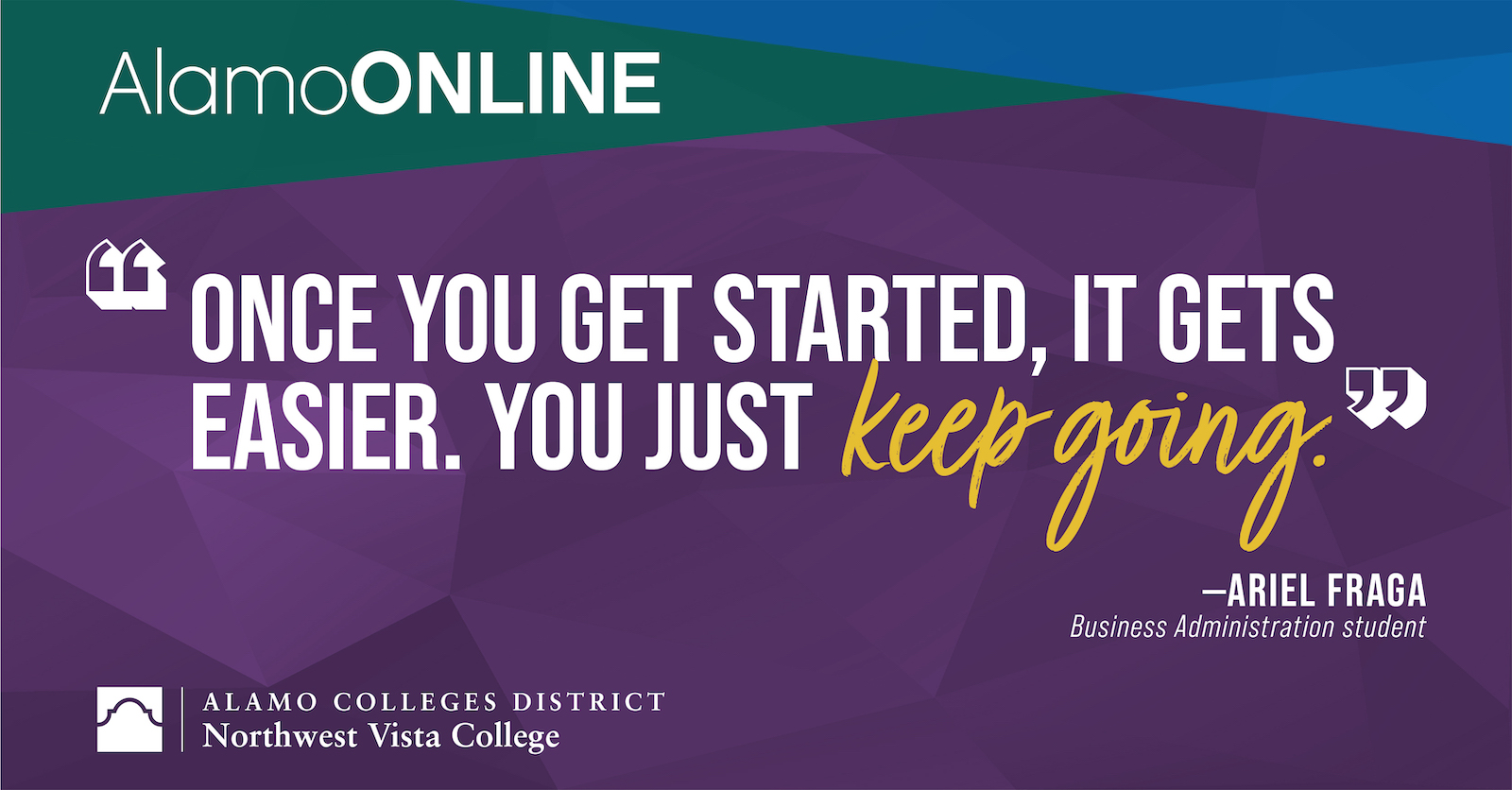 Ariel Fraga was hesitant to return to college. She had left her previous university eight years before to care for her newborn daughter but felt ready to return in 2020. “What held me back was being scared of the process,” she admits, “but once you get started, it gets easier. You just keep going.” Now Ariel attends Northwest Vista College as a fully online student studying business administration.