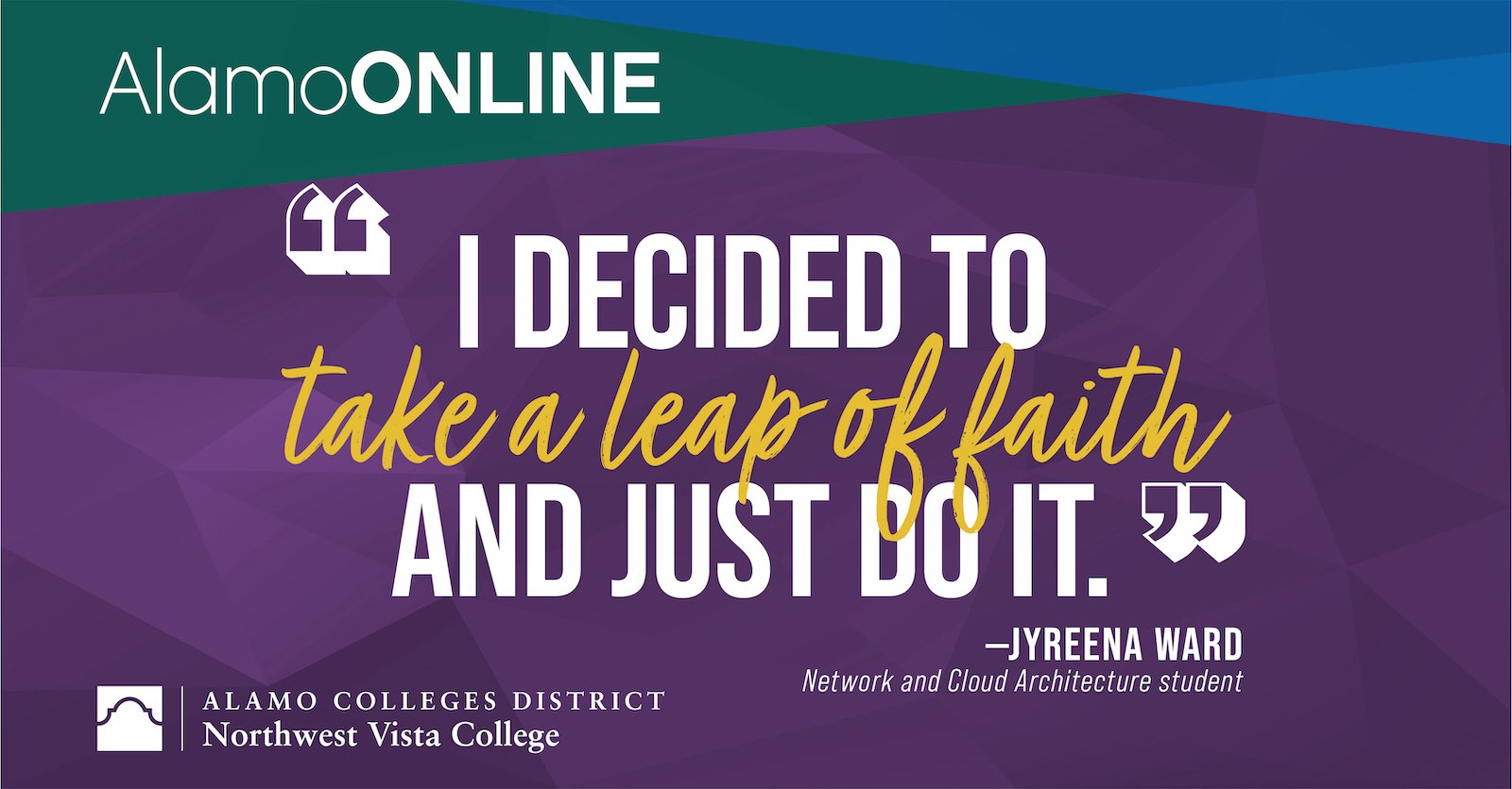 By the time Jyreena realized she was ready to return to school, she had a two-year-old son who was the reason she decided to try online learning at Northwest Vista College. As with many students who return to college after a long break, she struggled with anxiety and doubted her ability to succeed. She says, “There was a point where I questioned whether I even had the competency to make it through school, and I was scared. [...] I was full of fear. I was like, ‘Can I even do this? Can I even make it through this?’”