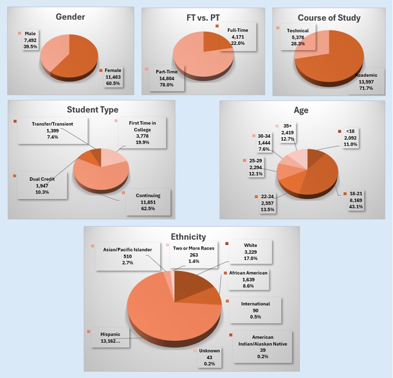 ENROLLMENT TRENDS BY CLASSIFICATION, FALL 2019-2023 2019 2020 2021 2022 2023 STUDENT TYPE First-Time in College 3,421 2,998 3,212 3,710 3,778 Dual Credit 2,304 2,516 2,077 1,782 1,947 First-Time Transfer (Transfer-in) 1,746 1,197 1,400 1,411 1,399 SEX Female 11,959 12,178 11,215 11,304 11,483 Male 7,540 7,053 6,462 6,929 7,492 ETHNICITY African-American 1,672 1,669 1,545 1,609 1,639 Asian 562 537 454 458 510 Hispanic 12,252 12,367 11,849 12,619 13,162 Other 551 470 379 365 435 White 4,462 4,188 3,450 3,182 3,229 AGE ≤17 2,384 2,579 2,154 1,895 2,092 18-21 7,461 7,242 6,914 7,755 8,169 22-24 2,798 2,643 2,321 2,495 2,557 25-30 3,154 3,149 2,861 2,661 2,630 31-35 1,466 1,471 1,425 1,396 1,347 ≥36 2,236 2,147 2,002 2,031 2,180 DIVISION Arts & Sciences 14,063 13,215 12,167 13,125 13,597 Professional & Technical 5,436 6,016 5,510 5,108 5,378 ENROLLMENT STATUS <12 hours(Part Time) 15,093 15,546 14,330 14,379 14,804 ≥12 Hours(Full-Time 4,406 3,685 3,347 3,854 4,171 DAY v EVENING Concurrent 1,395 1,107 553 655 648 Day 16,610 16,787 16,465 16,782 17,621 Evening 1,494 1,337 659 796 706 RESIDENCY Texas 18,953 18,644 17,136 17,442 18,181 Other States 329 363 337 612 578 International 217 224 204 179 216 TOTAL 19,499 19,231 17,677 18,233 18,975