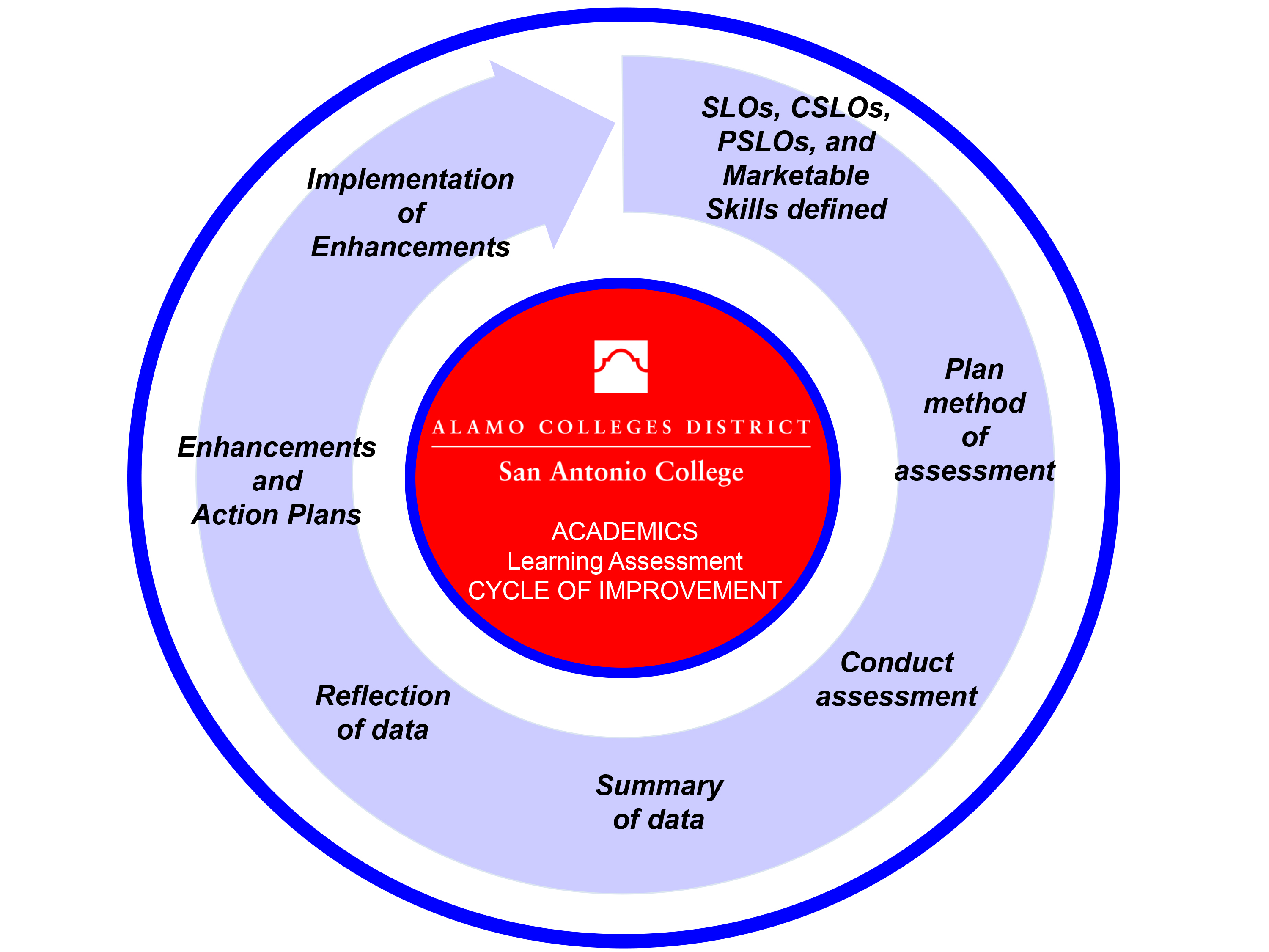 - Lead and support assessment process to continuously improve the campus practice of assessment for student learning outcomes.