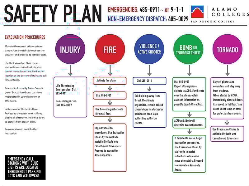 The Alamo Colleges District has established an emergency system that contacts all employees and students via email, telephones and text messages. The information is provided by the individuals through the Personal Information link on their ACES page. It is imperative that employees and students take the initiative to keep this information up to date. A Safety Plan has been created to help facilitate emergencies, should they occur. Please review the PDF list below.