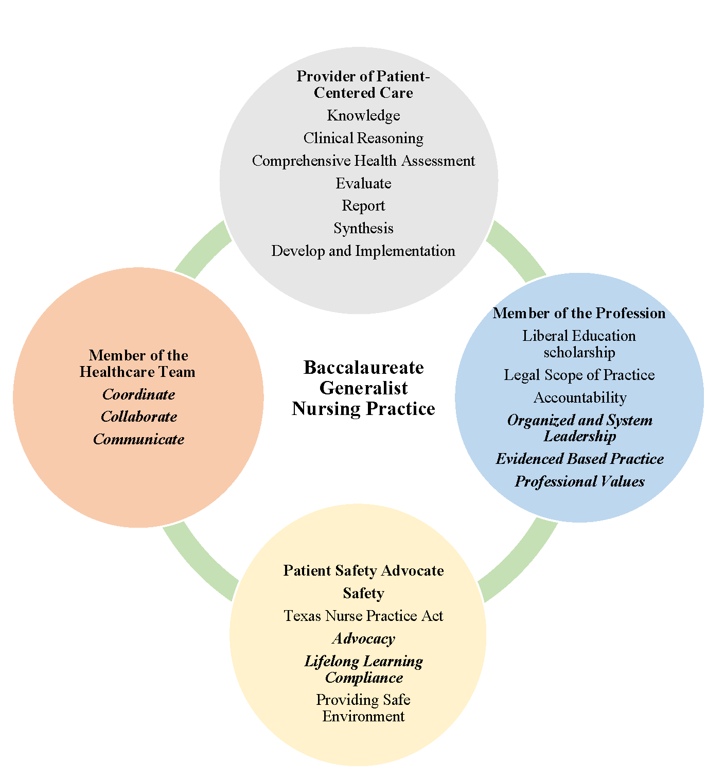 The SAC nursing programs utilize the differentiated essential competencies (DEC) to guide the instruction and curriculum to prepare nurses to practice in healthcare. The ADN roles responsibilities serve as a foundation for the BSN DEC. The conceptual framework for the SAC nursing program integrates the DEC and the AACN essentials for the Bachelor of Science in Nursing program. The conceptual model demonstrates all the roles and competencies required for a BSN to perform at a generalist level. The conceptual model has all three governing agencies together and identifies the DEC as the roles of the BSN nurse and the QSEN and AACN essentials as characteristics of the nurse. In the model, overlapping concepts are bolded and italicized. Many of the roles and skills needed to perform overlap and complement one another. The conceptual framework for the Baccalaureate Nurse differs because it encompasses leadership, community, and information technology. The Baccalaureate nurse charged to serve as a leader, recognize and develop solutions based on evidenced based practice and safety guidelines. The conceptual framework is derived by the three regulatory agencies and purpose for the program.
