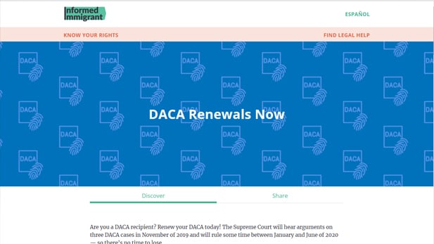 DACA Renewals Now is a hub that provides links to DACA guides, downloadable toolkit, graphics with renewal guidance and information on how to access renewal assistance from participating organizations