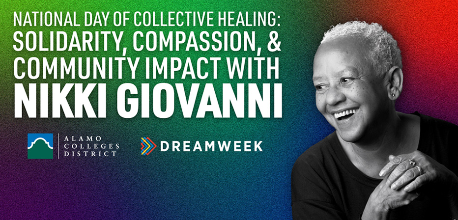 Due to unforeseen circumstances, the Alamo Colleges has rescheduled the 2024 National Day of Collective Healing presentation with poet Nikki Giovanni. The event will now take place from noon to 2 p.m. Wednesday, Jan. 31, at San Antonio College’s McAllister Auditorium.