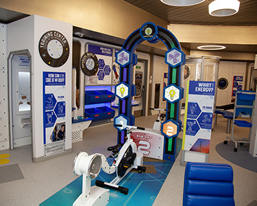 With their teacher acting as mission commander, the children exit into a space station-style room full of 12 hands-on, interactive science activities exploring geology, geography, physics, and other subjects. Many of the exhibits are bilingual. After completing their mission, they board the shuttle again to return to Earth.