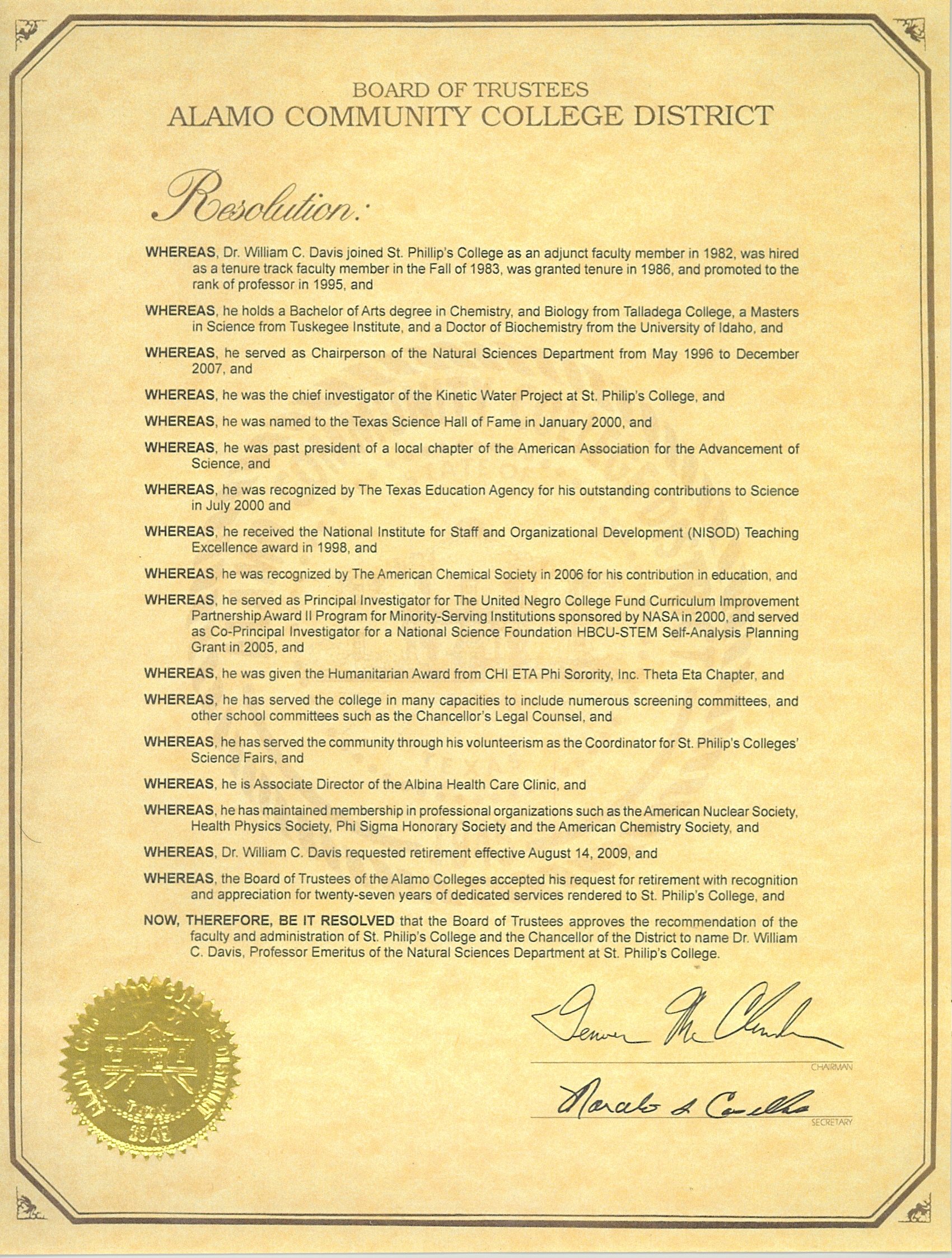 With a Ph.D. in hand, Dr. Davis began to explore human health, studying hay fever antigens, learning radioimmunoassay techniques, and spent nearly 15 years as director of United Medical Laboratories in Portland, Oregon. He helped establish a free medical clinic in Portland’s Albina neighborhood before relocating to San Antonio, Texas. From 1979 to 1982, Davis was a research associate in Molecular Pharmacology at the University of Texas Health Science Center San Antonio (uthscsa.edu) and, in 1983, he became a chemistry professor at St. Philip’s College (alamo.edu/spc).
