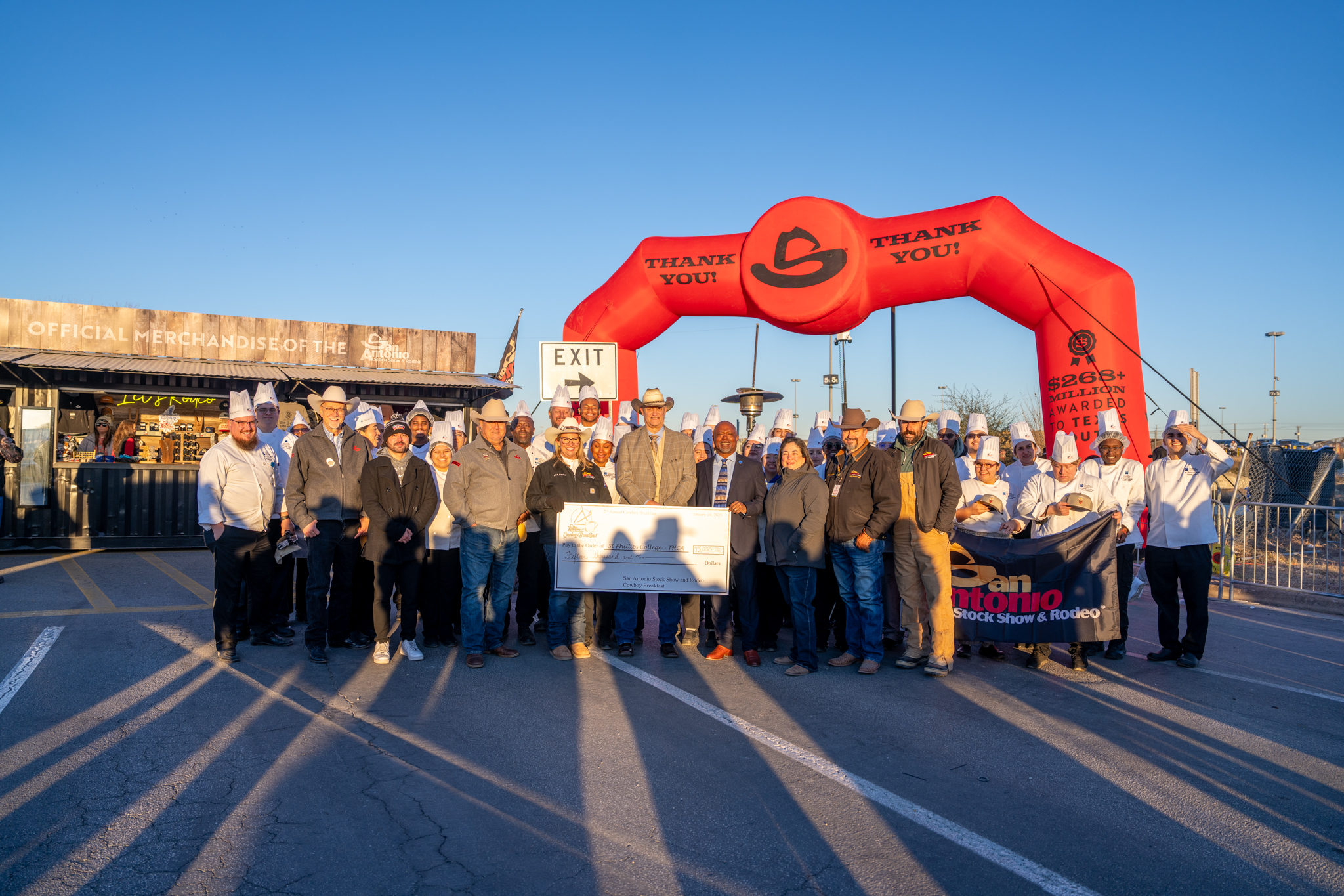The students began preparations at midnight, using 23,000 eggs, 3,700 sausage links, 475 pounds of beans, 475 pounds of bacon, and 475 pounds of chorizo to fill 15,000 tortillas. The event, held from 5 a.m. to 10 a.m. in Parking Lot 6 at the Frost Bank Center, marked the official start of the Bar-B-Que Cook-Off weekend and the San Antonio Stock Show & Rodeo.